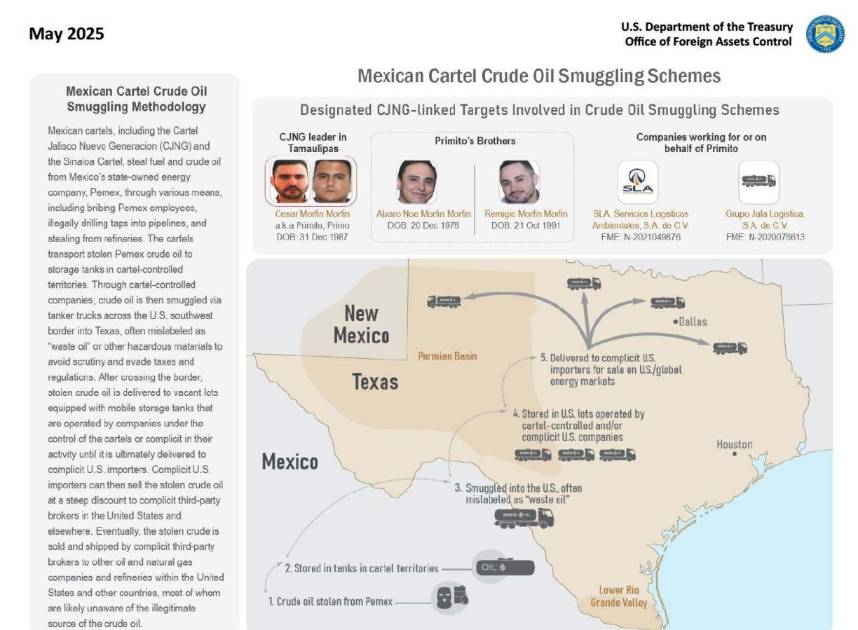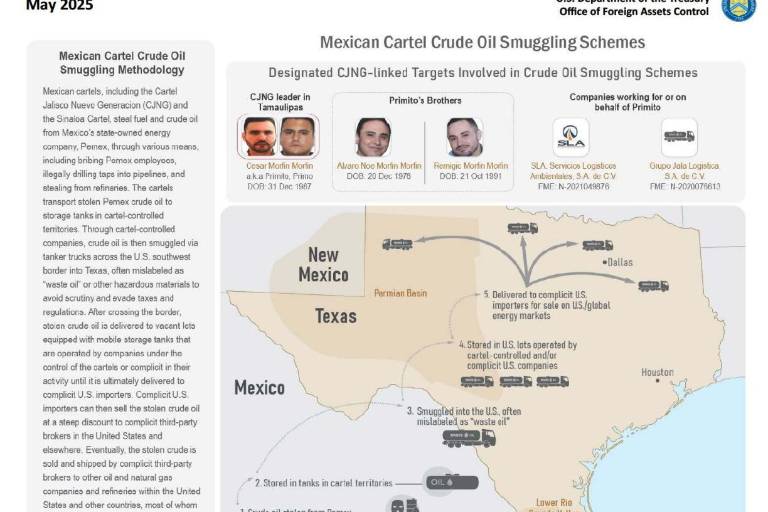 “El robo de combustible y el contrabando de petróleo crudo son fuentes de ingresos para la actividad narcoterrorista del CJNG, lo que les proporciona una lucrativa fuente de ingresos y les permite causar estragos en México y Estados Unidos. El Tesoro, como parte del esfuerzo integral de la Administración, seguirá utilizando todas las herramientas disponibles para combatir implacablemente a los cárteles de la droga y a las organizaciones terroristas extranjeras con el fin de que Estados Unidos vuelva a ser seguro”, declaró Scott Bessent, titular del Tesoro, en un comunicado.