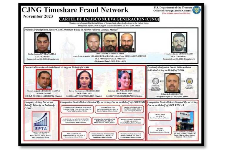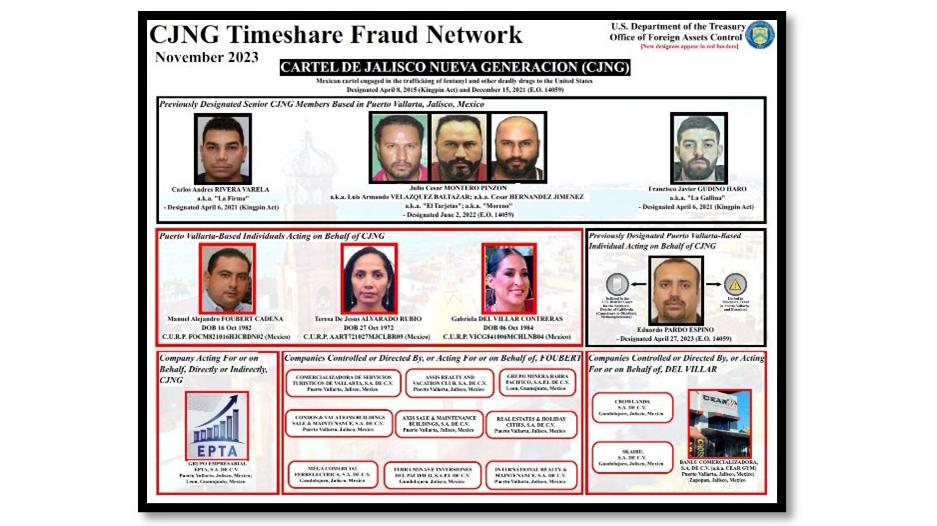 El Gobierno estadounidense los vincula de forma directa, con un fraude de tiempo compartido operado por miembros del Cártel de Jalisco Nueva Generación, que también fueron sancionadas por la OFAC, el 2 de marzo y el 27 de abril de 2023. Con la designación de las personas y las empresas por la OFAC, sus cuentas en Estados Unidos quedaron bloqueadas y se impide a cualquier entidad estadounidense involucrarse en negocios con ellos.