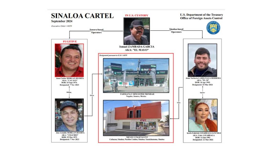 “Nieves y Paletas EVI, que opera como un negocio de postres helados, mantiene varias sucursales en Culiacán y los municipios circundantes, como Pueblos Unidos y Tacuichamona. De manera similar, Farmacia y Mini Super Trinidad, una farmacia minorista y supermercado en Nogales, Sonora, es propiedad, está controlada o dirigida por el narcotraficante con sede en Nogales, José Arnoldo Morgan Huerta (‘Chachio’), quien fue designado en noviembre de 2023 de conformidad con la EO 14059”, explicó el Gobierno estadounidense.