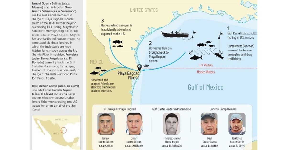 “Ismael Guerra Salinas (alias ‘Mayelo’) y su hermano Omar Guerra Salinas (alias ‘Samorano’) son los miembros del Cártel del Golfo a cargo de Playa Bagdad. Además de supervisar la pesca INDNR, ‘Mayelo’ y ‘Samorano’ manejan las operaciones de tráfico de drogas en Playa Bagdad. ‘Mayelo’ también ha facilitado el tráfico de personas realizado a través de estas lanchas, en las que se mantiene a los individuos ocultos para transportarlos a través del Río Grande. Además, Francisco Javier Sierra Angulo (alias ‘El Borrado’) actualmente lidera el Cártel del Golfo en Matamoros, Tamaulipas, México. ‘El Borrado’ anteriormente estaba a cargo de la Plaza Valle Hermoso para el Cártel del Golfo”, indicó la OFAC.