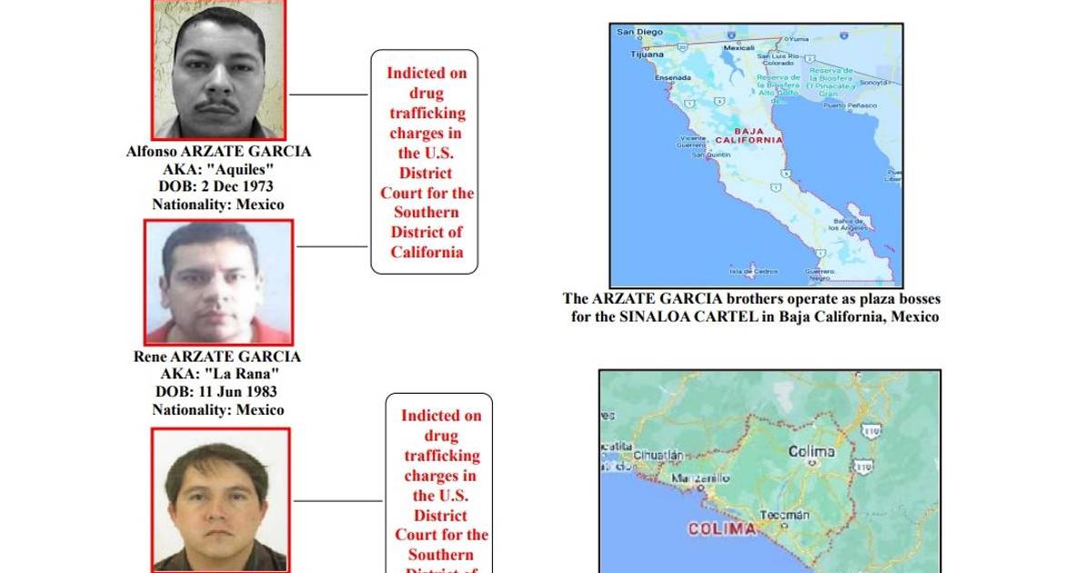 “Conocidos por ser extremadamente violentos, los hermanos Arzate García también están involucrados en la realización de operaciones de cumplimiento, como secuestros y ejecuciones, para el Cártel de Sinaloa. En acusaciones separadas, ambas presentadas el 25 de julio de 2014, los hermanos Arzate García fueron acusados de delitos de narcotráfico en el Tribunal Federal de Distrito para el Distrito Sur de California. A la fecha, los hermanos Arzate García continúan prófugos”, detalló el Gobierno estadounidense.