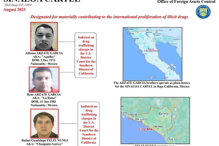 El Departamento del Tesoro de EU indicó que como “jefes de plaza” con sede en Baja California, para el Cártel de Sinaloa, los hermanos Arzate García, manejan las operaciones de narcotráfico en Tijuana y los municipios circundantes, además de que están involucrados en la importación de grandes cantidades de drogas ilícitas, incluido el fentanilo, al país norteamericano.