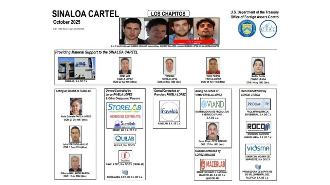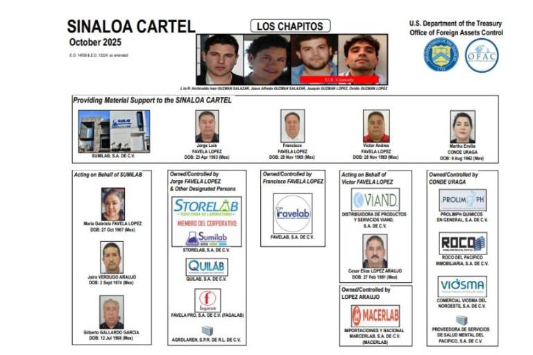 La Oficina de Control de Activos Extranjeros (OFAC, por sus siglas en inglés), del Departamento del Tesoro de Estados Unidos, sancionó este 6 de octubre a ocho personas y 12 empresas mexicanas -la mayoría de ellas sinaloenses- vinculada a la facción de “Los Chapitos”.