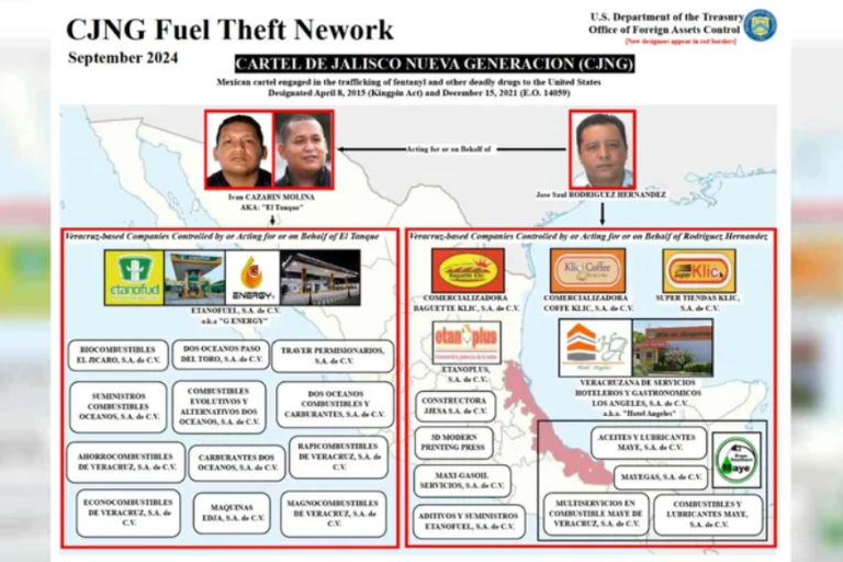 La Oficina de Control de Activos Extranjeros (OFAC, por sus siglas en inglés), del Departamento del Tesoro de Estados Unidos, sancionó a nueve mexicanos y 26 empresas vinculadas a una red de “huachicoleros” o contrabandistas de combustible, delito que generaría millones de dólares en beneficio del Cártel Jalisco Nueva Generación (CJNG).