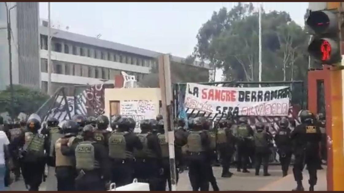 Las televisoras mostraron a casi un centenar de policías antimotines entrando después que una tanqueta rompió una de las puertas de la capitalina Universidad Nacional Mayor de San Marcos, la más antigua de Sudamérica. También se observó la detención de al menos dos decenas de manifestantes a quienes colocaron boca abajo contra el piso.