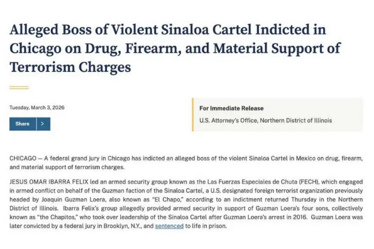 Un gran jurado federal en Chicago, Illinois, presentó el 3 de marzo cargos en contra de Jesús Omar Ibarra Félix, “El Chuta”, de 49 años, originario de Los Mochis, México, señalado como jefe de un grupo armado vinculado a la facción Guzmán del Cártel de Sinaloa, organización designada por Estados Unidos como organización terrorista extranjera.