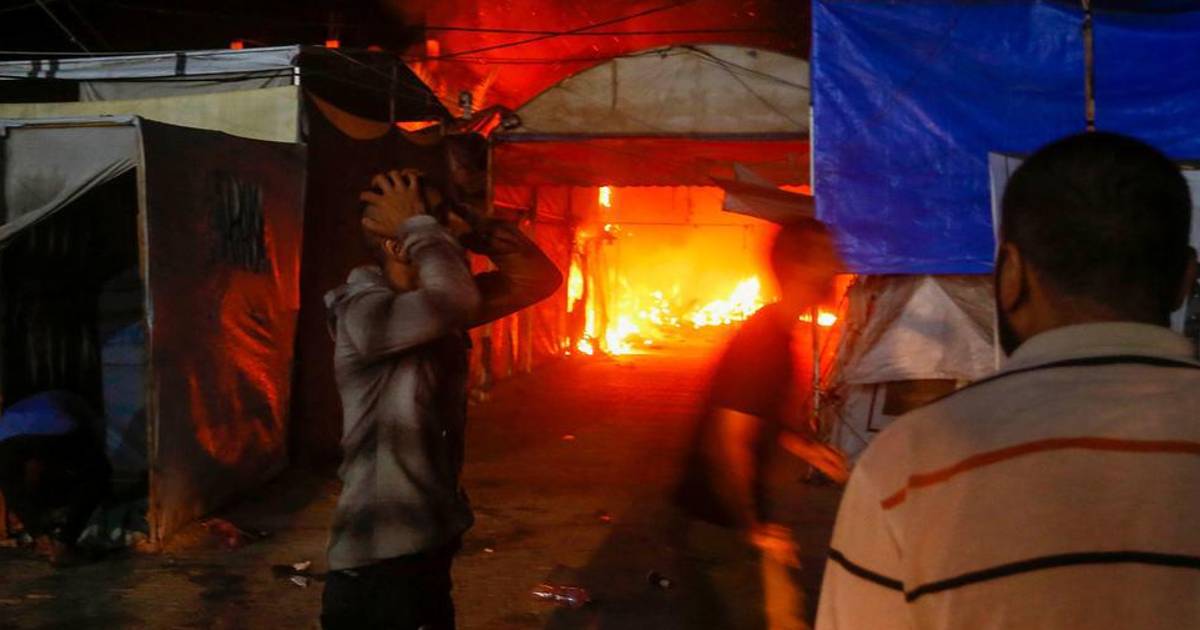 Otros videos dejaron ver un intenso incendio y humo en las carpas de refugio, mientras los equipos de emergencia retiraban lo que parecía ser un cuerpo gravemente quemado del suelo de una tienda carbonizada, después de cubrirlo con una manta.