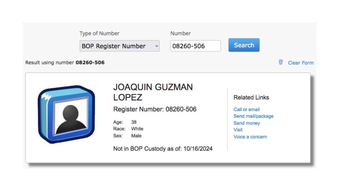 Pero, según una consulta realizada por este reportero, el 17 de octubre, en la página web del BOP estadounidense, el que fuera uno de los presuntos líderes de “Los Chapitos” ya no se encuentra bajo la custodia de dicha institución gubernamental, por lo que, hasta el momento de la redacción de la presente nota, se desconoce su ubicación.
