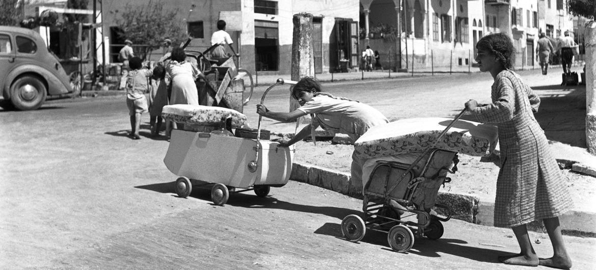 Un convoy con refugiados y sus pertenencias se dirige de Gaza a Hebrón en Cisjordania. Foto: © 1949 Archivo fotográfico de la ONU
