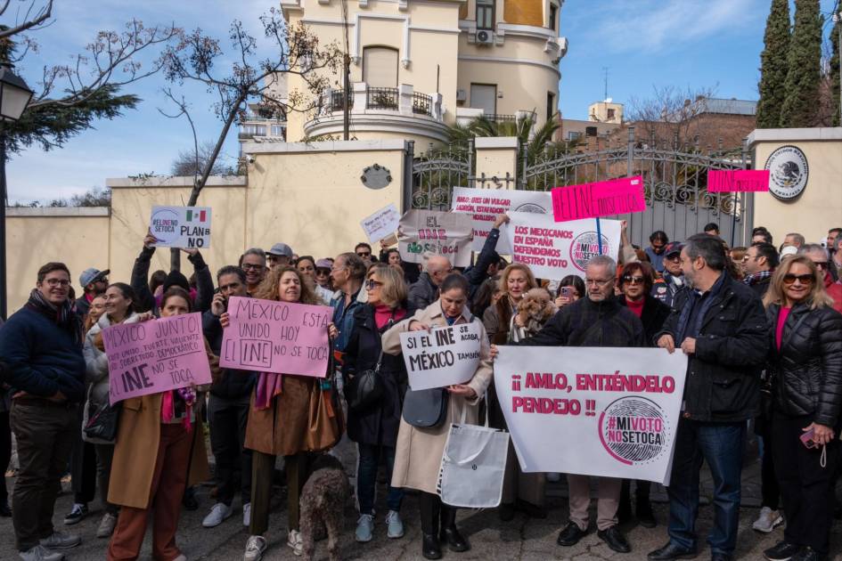 MÉXICO._ Un grupo de manifestantes se reunió esta mañana a las afueras de la Embajada de México en España, ubicada en Madrid, para mostrar su apoyo a la marcha que se realizó en distintas ciudades del país en defensa del Instituto Nacional Electoral (INE) y contra el Plan B de la Reforma Electoral, impulsado por el Presidente Andrés Manuel López Obrador.