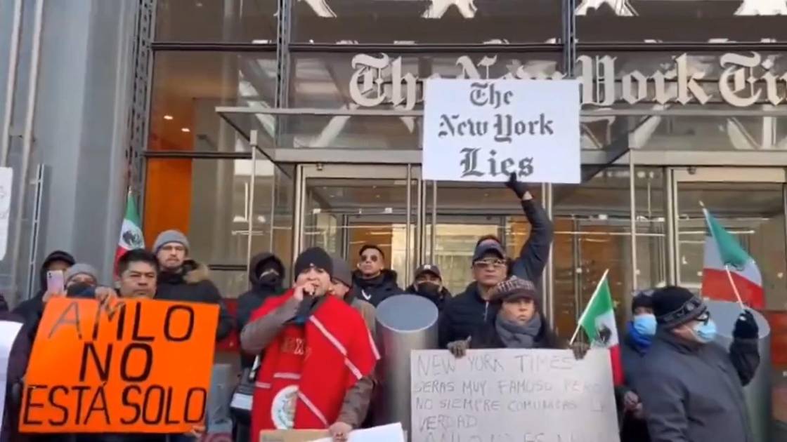 Un grupo de migrantes simpatizantes del presidente Andrés Manuel López Obrador protestó a las afueras del diario estadounidense The New York Times y acusaron al diario de calumniar al mandatario.