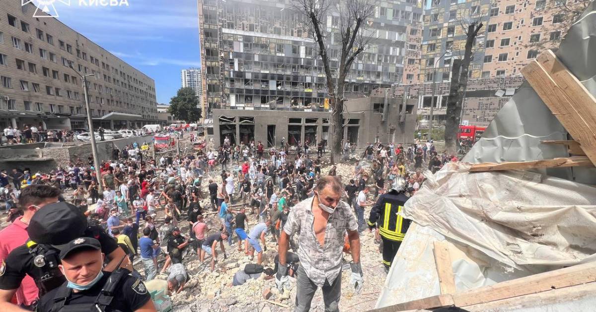 Las fotografías difundidas por los funcionarios del hospital infantil Okhmatdyt de Kiev mostraban a personas excavando entre los escombros, una columna de humo negro que se elevaba sobre el edificio destruido y personal médico con uniformes médicos manchados de sangre.