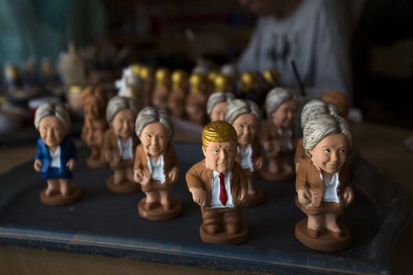 Una compañía catalana que fabrica miniaturas de cerámica para pesebres navideños ha creado versiones especiales de los candidatos presidenciales estadounidenses. Estas figuras muestran típicamente a un campesino agachado con las nalgas descubiertas en acción de defecar.