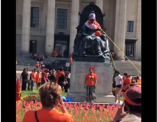 CANADÁ._ Una estatua de la Reina Victoria, frente al Edificio Legislativo provincial de Manitoba, en Winnipeg, Canadá, fue derribada por manifestantes, en medio de la creciente indignación en el país, tras los hallazgos en los últimos dos meses de cientos de cadáveres, en su mayoría de niños, en varios antiguos internados donde en el pasado “reeducaban” a los indígenas.