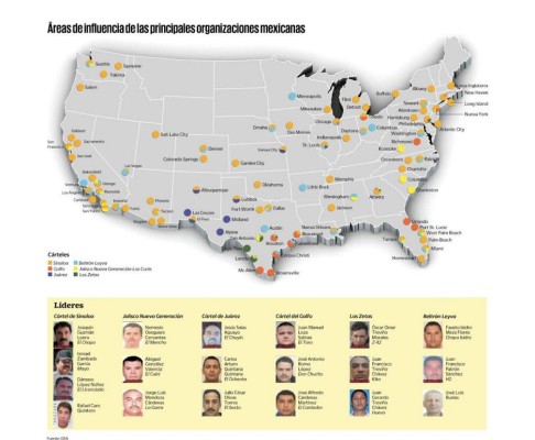 Con una gran penetración en EU se menciona en primer lugar al Cartel de Sinaloa, después viene creciendo con fuerza el Cartel Jalisco Nueva Generación, y los siguen el Cartel de Juárez, El Golfo, Los Zetas y los Beltrán Leyva.