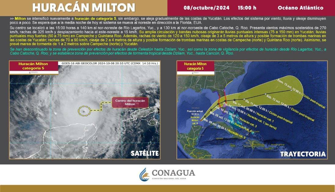 Luego de que a las 21 horas de un día antes, el huracán estuvo a 60 kilómetros de las costas de la península de Yucatán, continuando su trayectoria hacia el noreste, con rumbo a Florida, según indicó Laura Velázquez Alzúa, titular de la Coordinación Nacional de Protección Civil (CNPC), durante la conferencia de prensa matutina presidencial, llevada a cabo desde el Salón Tesorería del Palacio Nacional.