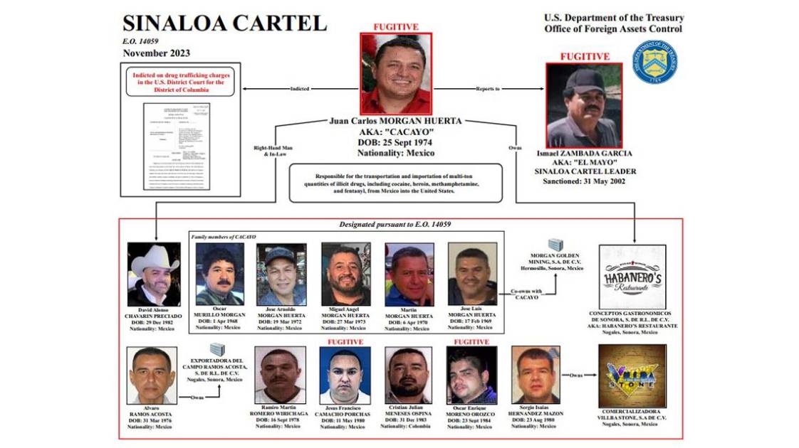 La OFAC designó a Juan Carlos Morgan Huerta, José Arnoldo Morgan Huerta, José Luis Morgan Huerta, Miguel Angel Morgan Huerta, Martín Morgan Huerta, Oscar Murillo Morgan, David Alonso Chavarin Preciado, Jesús Francisco Camacho Porchas, Oscar Enrique Moreno Orozco, Cristian Julián Meneses Ospina, Ramiro Martín Romero Wirichaga, Sergio Isaías Hernández Mazón y Álvaro Ramos Acosta, de conformidad con la Orden Ejecutiva (EO) 14059, “por haber participado o intentado participar en actividades o transacciones que han contribuido materialmente o representan un riesgo significativo de contribuir materialmente a, la proliferación internacional de drogas ilícitas o de sus medios de producción”.