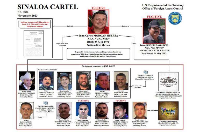La Oficina de Control de Activos Extranjeros (OFAC, por sus siglas en inglés) del Departamento del Tesoro de Estados Unidos, sancionó a 13 miembros del Cártel de Sinaloa -varios de los cuales son fugitivos- y a cuatro entidades con sede en Sonora, las cuales “representan una porción significativa del fentanilo ilícito y otras drogas mortales traficadas hacia los Estados Unidos”.