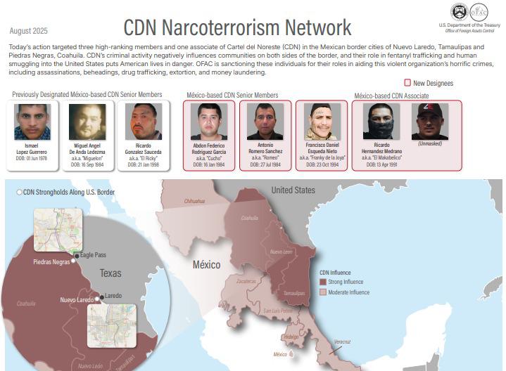 La Oficina de Control de Activos Extranjeros (OFAC, por sus siglas en inglés), del Departamento del Tesoro de Estados Unidos (USDT, por sus siglas en inglés), sancionó a tres miembros “de alto rango” y a un “socio prominente” del Cártel del Noreste (CDN), con sede en México, anteriormente conocido como Los Zetas.