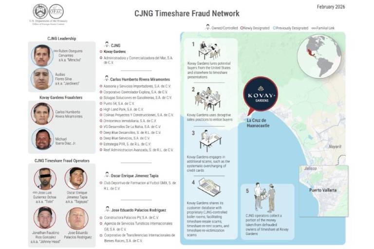 El Departamento del Tesoro de Estados Unidos sancionó el 19 de febrero una red de fraude de tiempo compartido controlada por el Cártel de Jalisco Nueva Generación, que incluye el resort Kovay Gardens, cinco personas físicas y 17 empresas mexicanas.
