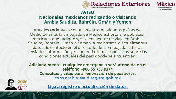 — Embajada de México en Arabia Saudita (@Embamex_ASA) February 28, 2026