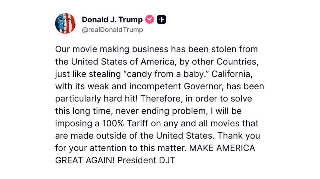 “Nuestro negocio de producción de películas ha sido robado de los Estados Unidos de América por otros países, justo como robar ‘dulces de un bebé’. California, con su débil e incompetente Gobernador, ha sido particularmente golpeada con fuerza”, escribió Trump, en su cuenta de Truth Social.