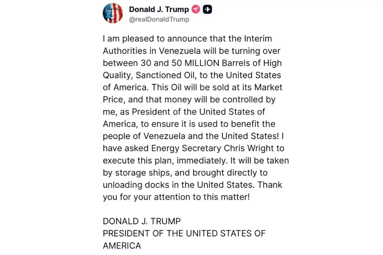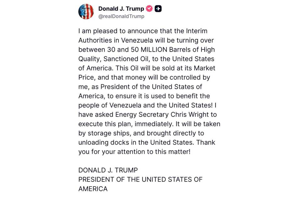 Trump difundió el anuncio en su plataforma Truth Social donde detalló que el crudo venezolano sería vendido a precio de mercado y que el dinero generado quedaría bajo su supervisión directa. “Me complace anunciar que las autoridades interinas de Venezuela entregarán entre 30 y 50 millones de barriles de petróleo sancionado de alta calidad a Estados Unidos de América”, escribió el mandatario republicano.