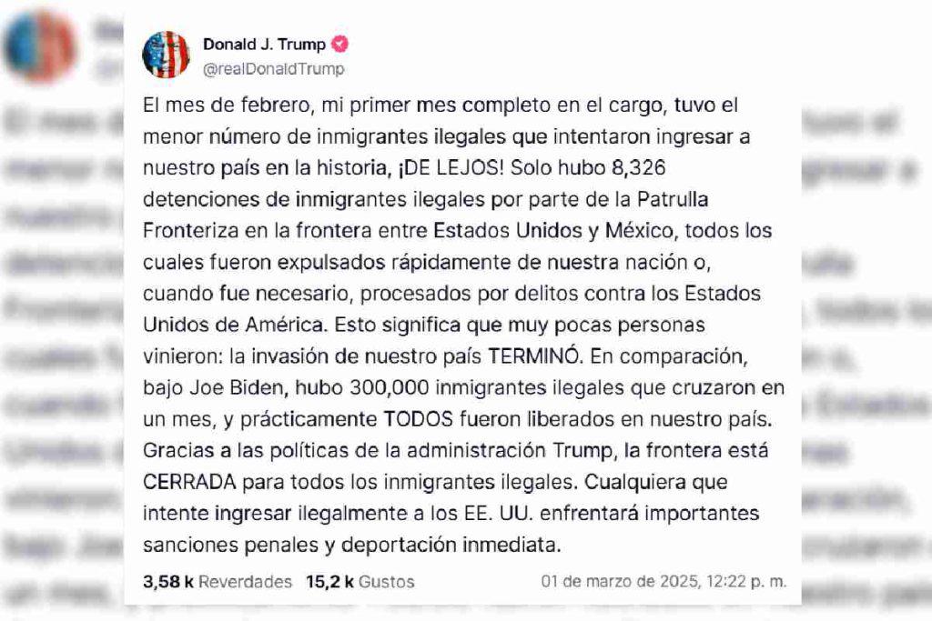 En su publicación destacó que es una importante disminución en comparación con los 300 mil inmigrantes irregulares que cruzaron EU en un mes durante el gobierno de Joe Biden.