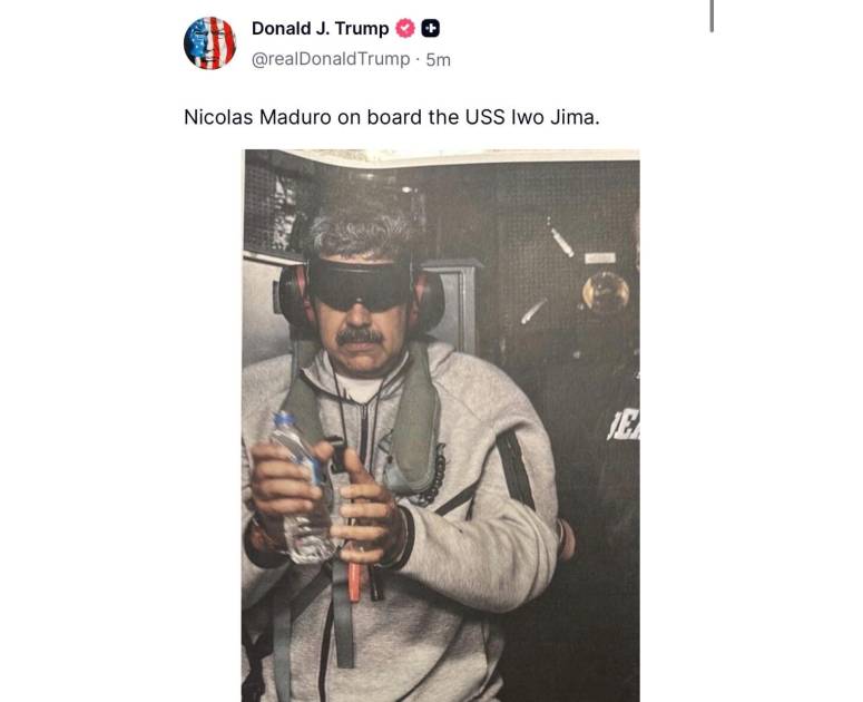 El Presidente de Estados Unidos, Donald Trump difundió una fotografía de Nicolás Maduro Moros tras su captura. El material gráfico muestra al detenido a bordo del buque de asalto anfibio USS Iwo Jima, bajo custodia de las fuerzas militares estadounidenses.