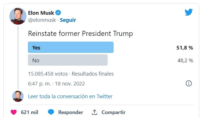 “El pueblo ha hablado. Trump será reintegrado. Vox Populi, Vox Dei”, publicó Musk al dar a conocer los resultados de la encuesta que estuvo abierta durante 24 horas y que tenía dos opciones de respuesta a: “Regresar la cuenta al ex Presidente Trump”.