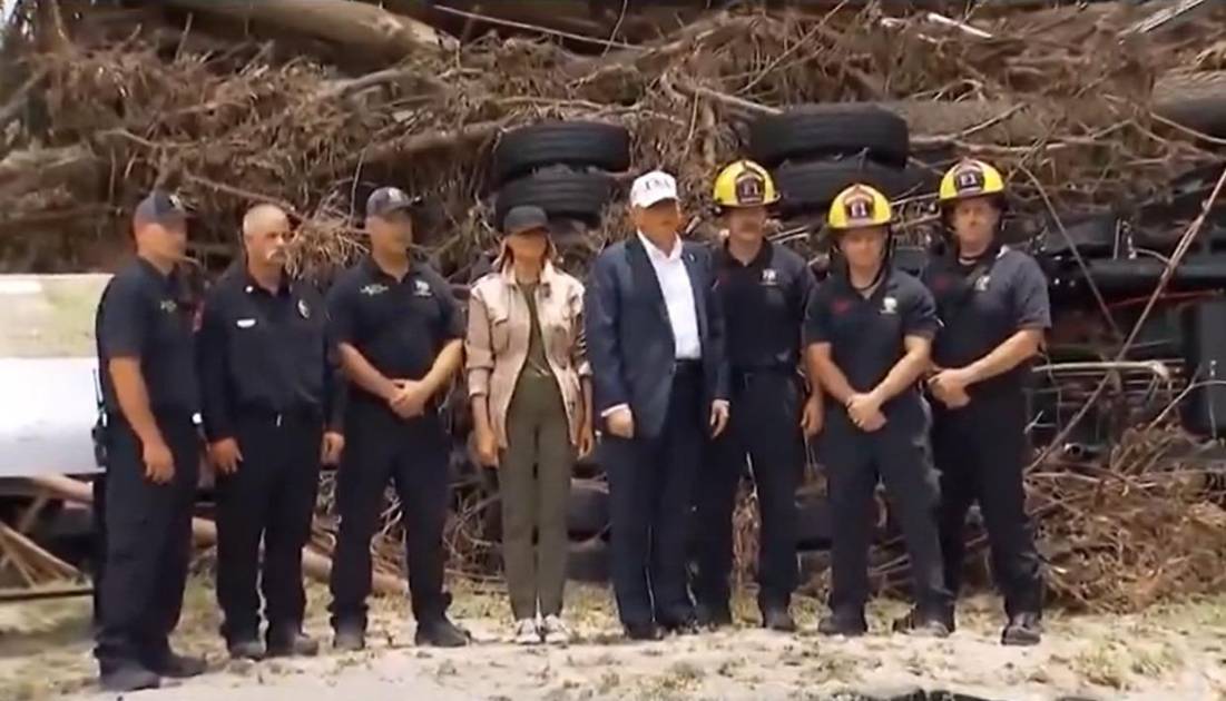 Durante la visita, Trump portó una gorra blanca con insignias estadounidenses y junto a su esposa Melania posó para fotografías junto a funcionarios locales, policías y personal de emergencia.