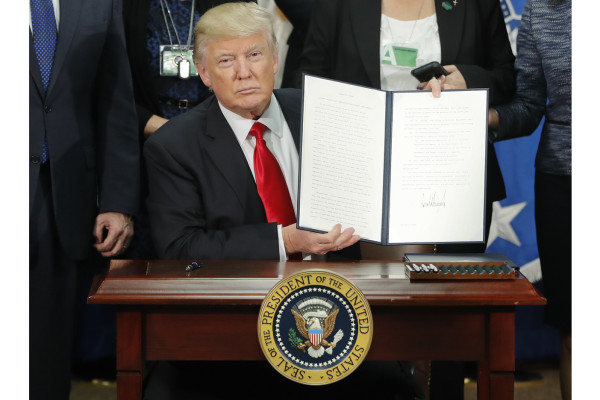 La firma de la orden ejecutiva se realizó con una más relacionada con el trato a migrantes: el retiro de fondos federales a las ciudades que se han convertido en santuarios para quienes han ingresado a Estados Unidos sin documentos.