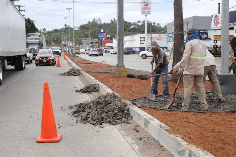 En la mayor parte de la vialidad ya se realizaron dichas labores con palmeras, césped, piedras de colores y cactus, pero aún quedan algunos tramos como frente a la Estación de Bomberos 1 “Doctor Olavo Corona”, un tramo frente a las instalaciones de la Tercera Región Militar y otro frente al Fraccionamiento del Bosque.
