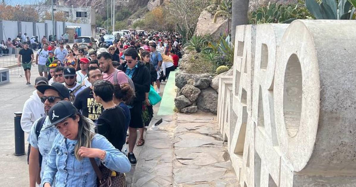 La larga fila llega hasta la escollera. Hasta las 11:30 horas había un registro de mil 879 personas que ya había ingresado a este lugar donde se encuentra el Mirador de Cristal, construido en la cima de la antigua isla El Crestón; esta amalgama histórica y natural es un valioso patrimonio de todos los mazatlecos y un referente de Sinaloa para el mundo.