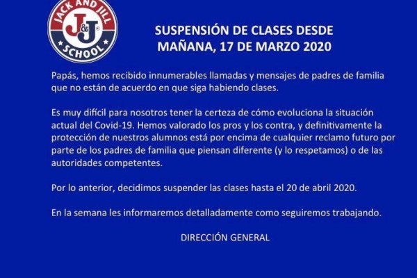 "Iniciarán el periodo de contingencia a partir de mañana martes 17 de marzo, es decir, las clases presenciales serán suspendidas a partir de esta fecha, reanudándose el 20 de abril", precisa el comunicado del Andes y Bachillerato Anáhuac.