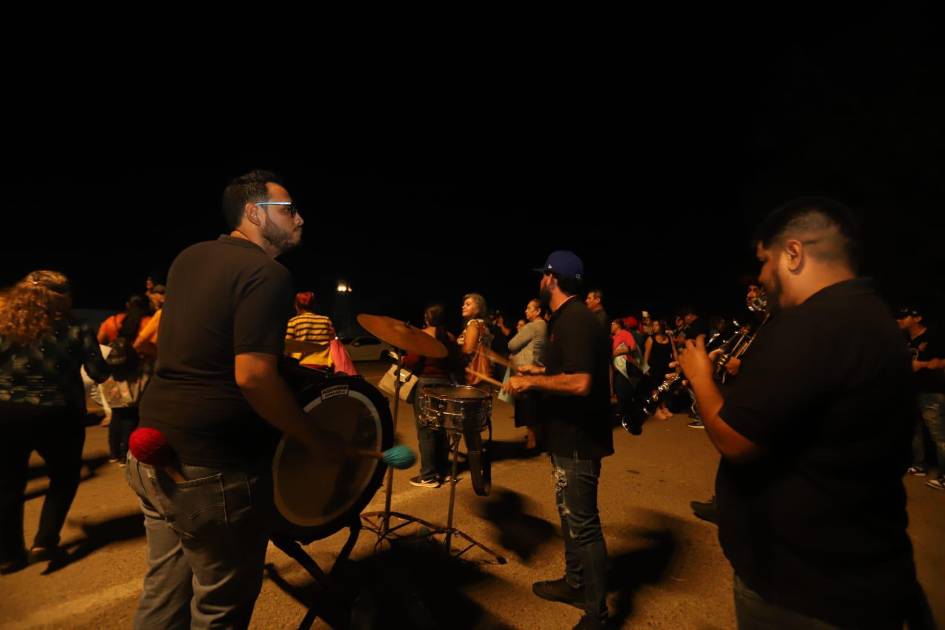 Durante el encuentro, la música de banda en vivo acompañó la espera, lo que generó un ambiente animado entre los asistentes, quienes con porras, pancartas, saludos y muestras de apoyo, el público expresó su respaldo mientras aguardaba la llegada de la titular del Ejecutivo federal.