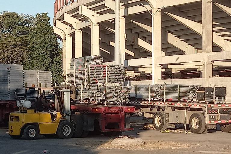 Varios camiones con tarimas fueron vistos la tarde de este lunes a las afueras del estadio de beisbol Teodoro Mariscal, con estructuras metálicas similares a las que se utilizan para armar los templetes de espectáculos musicales.