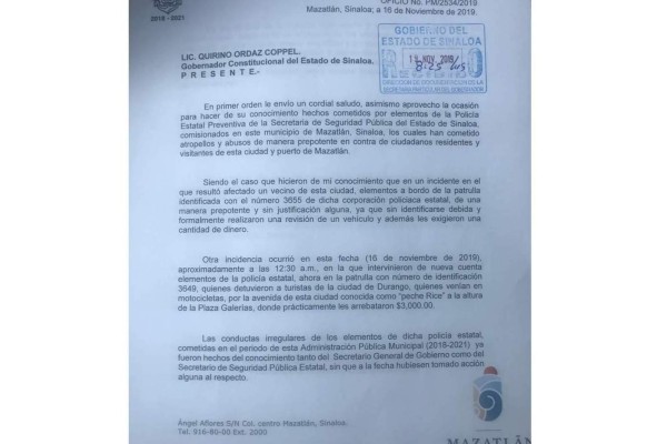 En el oficio PM/2534/2019, con fecha del 16 de noviembre de 2019, el Presidente municipal expone supuestos casos de abusos cometidos por policías estatales en este puerto. En el primero —de acuerdo con el documento—, resultó afectado un vecino de Mazatlán, a quien le hicieron una revisión arbitraria y le exigieron una fuerte cantidad de dinero. Señalaron como responsables a los agentes de la patrulla identificada con el número 3655. Aunque en este caso no especifica fecha y lugar, de la segunda incidencia detalla que el 16 de noviembre a las 12:30 horas, se detuvo a turistas que viajaban en una motocicleta por la avenida Peche Rice, a la altura de la plaza Galerías, “donde prácticamente les arrebataron 3 mil pesos”.