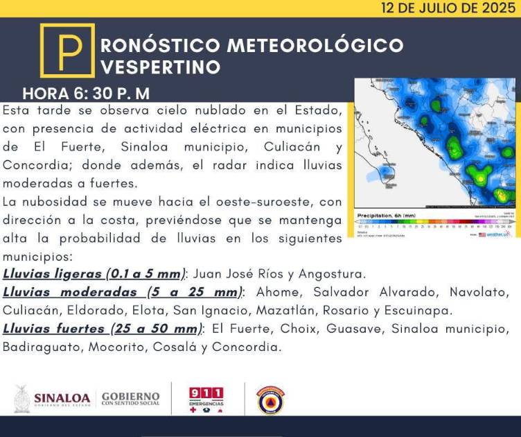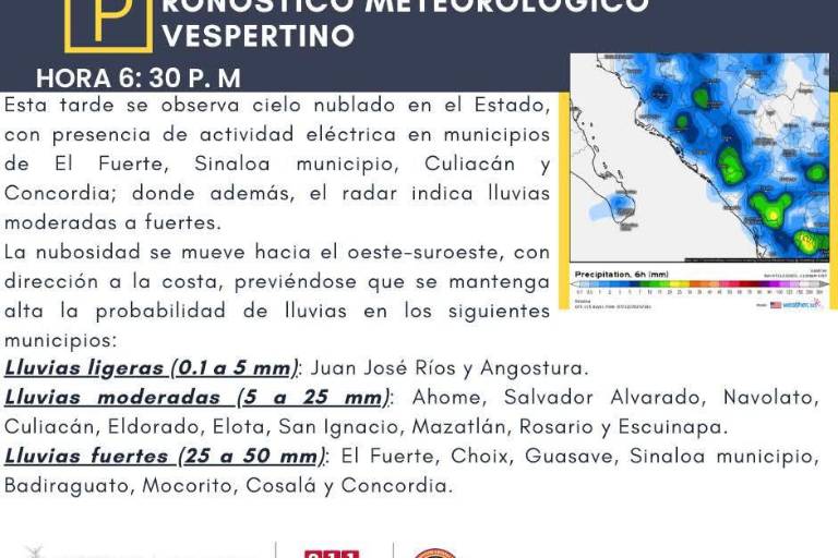 Óscar Roberto Osuna Tirado, coordinador municipal de Protección Civil, señaló que los modelos de pronóstico emitidos reflejan lluvias de moderadas a fuertes con acumulados variables de 5 a 25 milímetros e intensas en las zonas de montaña.