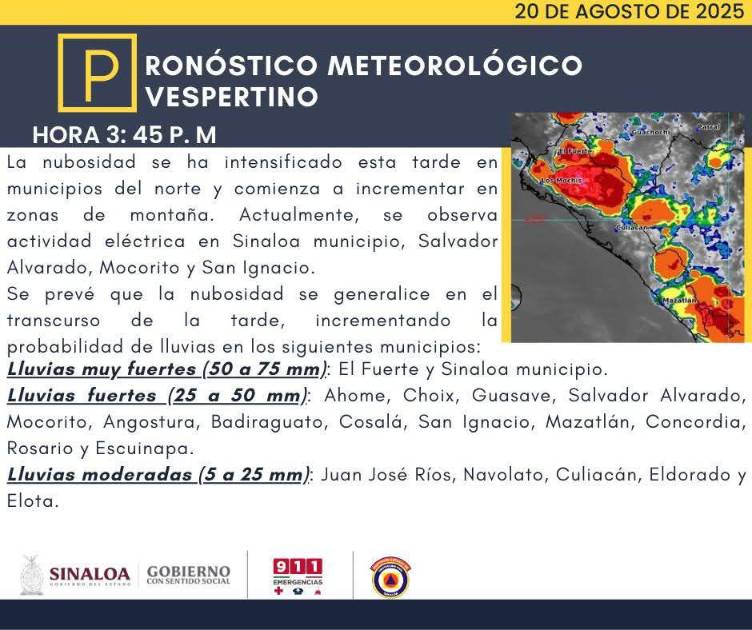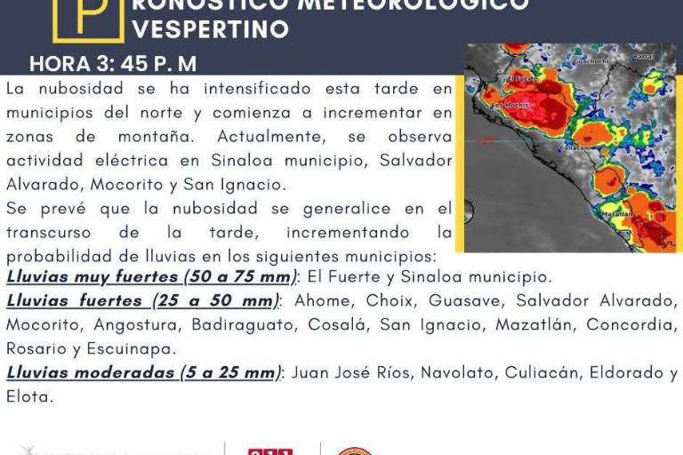 Óscar Roberto Osuna Tirado, indicó que las precipitaciones para Mazatlán podrían ser fuertes, con acumulados que marcarán variaciones de entre 25 a 50 milímetros, acompañadas de actividad eléctrica y rachas de viento de 50 y 70 km/h.