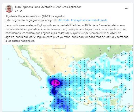 “Siguiente Huracán será Irvin (28-29 de agosto). Las condiciones meteorológicas indican la probabilidad de un 90 % de la formación del nuevo huracán de la temporada el cual se llamará Irwin, cuya primera trayectoria con la incertidumbre considerable considera que llegaría a las costas de Nayarit-Sur de Sinaloa entre el 28-29 de agosto, habrá que darle seguimiento pues ya están subiendo un poco mas de latitud y cercanos a las costas nacionales”, dice el comunicado de Espinosa Luna, en su cuenta de Facebook.
