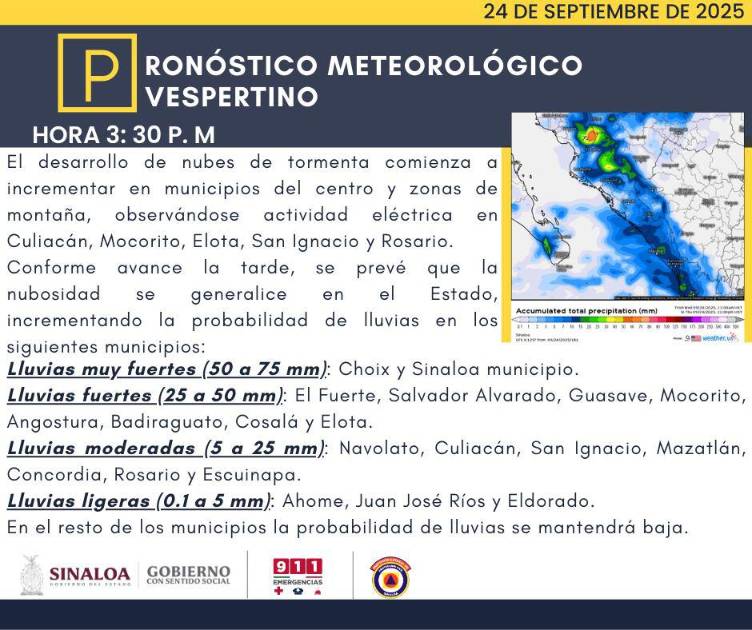 Óscar Roberto Osuna Tirado informó que las zonas de montaña podrían recibir la mayor cantidad de agua, mientras que para Mazatlán se prevén lluvias moderadas con acumulados de 5 a 25 milímetros; en algunos municipios del Estado habrá actividad eléctrica.