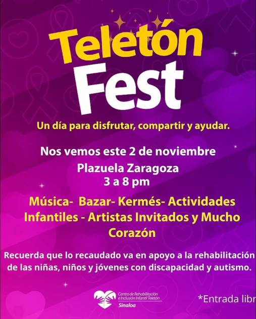 “Ven a disfrutar una tarde inolvidable en el Teletón Fest: bazar, comida, snacks, área infantil, pasarela de catrinas y espectáculos para toda la familia. Recuerda que lo recaudado va en apoyo a los niños, niñas y jóvenes con discapacidad y autismo de Sinaloa. ¡Te esperamos!”, se lee en redes sociales.