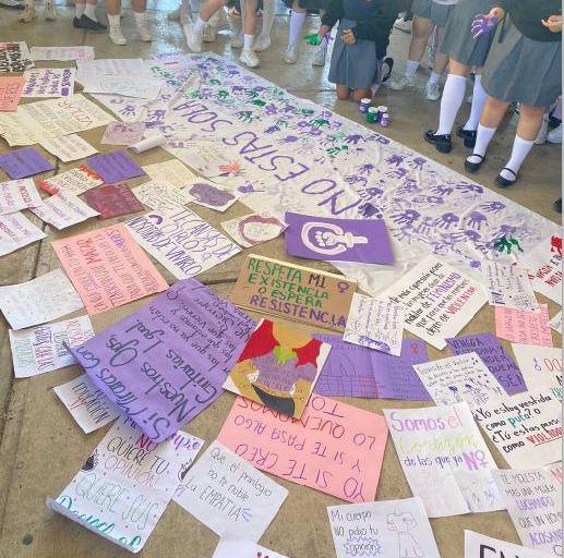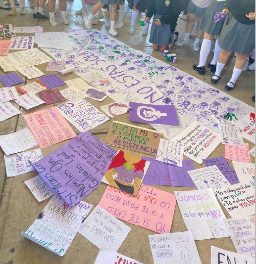 Las estudiantes se reunieron bajo la techumbre del plantel y cerca de la entrada principal. Formaron un círculo y colocaron en el piso cartulinas donde denunciaron el acoso y el hostigamiento.