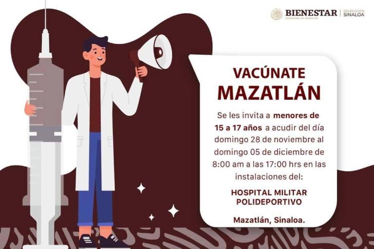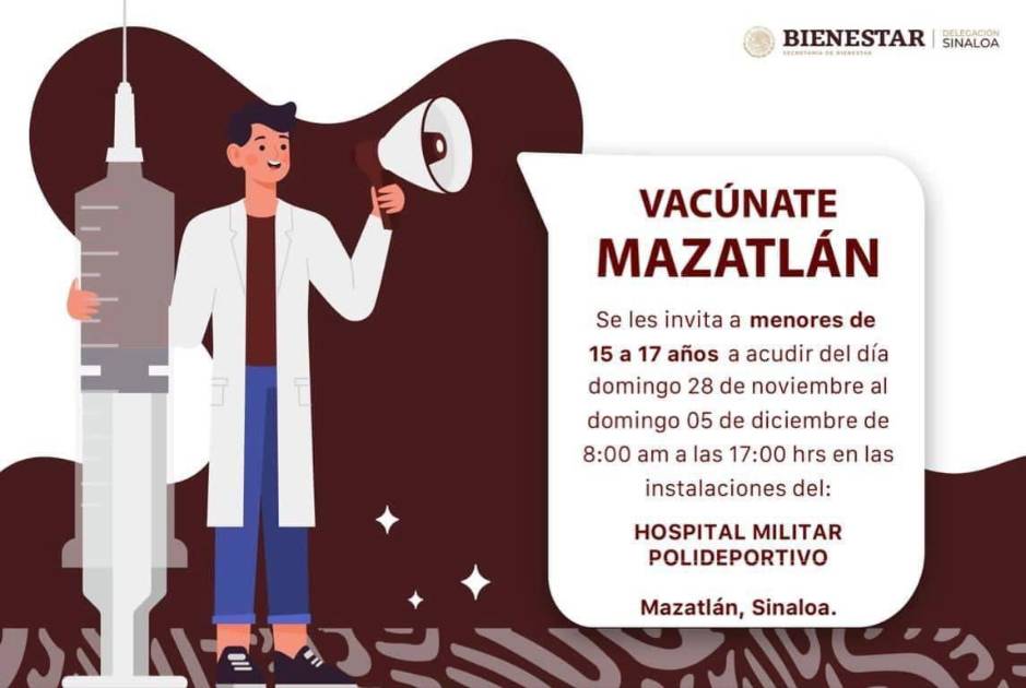MAZATLÁN._ Menores de 15 a 17 años podrán acudir al Polideportivo de la UAS y al Hospital Militar, en Mazatlán, desde este domingo 28 de noviembre hasta el próximo domingo 5 de diciembre, para vacunarse contra el Covid-19, informó la Secretaría de Bienestar Social delegación Sinaloa.