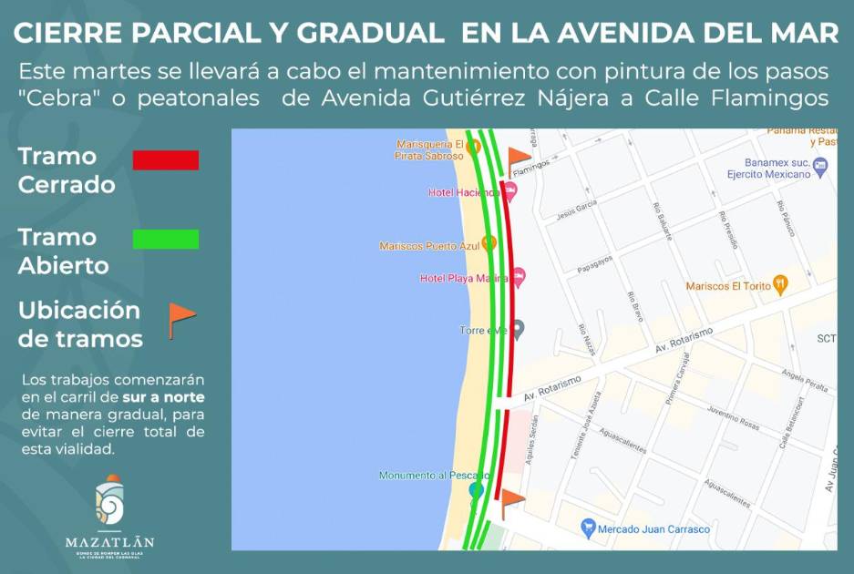 MAZATLÁN._ Este martes se realizarán trabajos de pintado en los pasos peatonales de la Avenida del Mar, por lo que el tránsito vehicular se verá afectado de manera parcial y momentánea, ya que la circulación se reducirá a un solo carril.