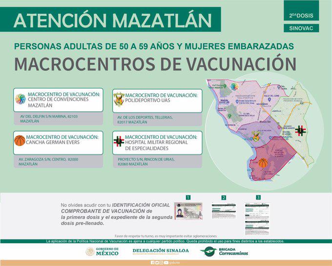 MAZATLÁN._ Adultos de 50 a 59 años y mujeres embarazadas mayores de 18 años que cuenten con más de nueve semanas de gestación, de la zona urbana y rural de Mazatlán recibirán a partir de este jueves la segunda dosis de la vacuna contra el Covid-19 de Sinovac, informó la Delegación de Bienestar en Sinaloa.