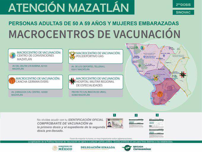 La aplicación de la segunda dosis será del jueves 24 al domingo 27 de junio y los turnos serán distribuidos en los cuatro macrocentros de vacunación en orden alfabético y horario, ubicados en Centro de Convenciones Mazatlán, Polideportivo UAS, Cancha German Evers y Hospital Militar Regional de Especialidades.