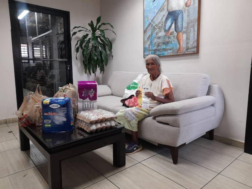Sebastiana, acompañada de su hija Jacinta, recibió dos carteras con huevos, leche, cereal, pañales para adulto, un paquete de papel higiénico, aceite, sopas, puré, galletas, café, azúcar, arroz y atún. Además de una bolsa con ropa.