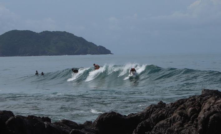 Aunque la elevación e intensidad del oleaje ya va bajando en Mazatlán, surfistas aprovechan este fin de semana el oleaje de hasta 1.30 metros para practicar su deporte en Playa Brujas.